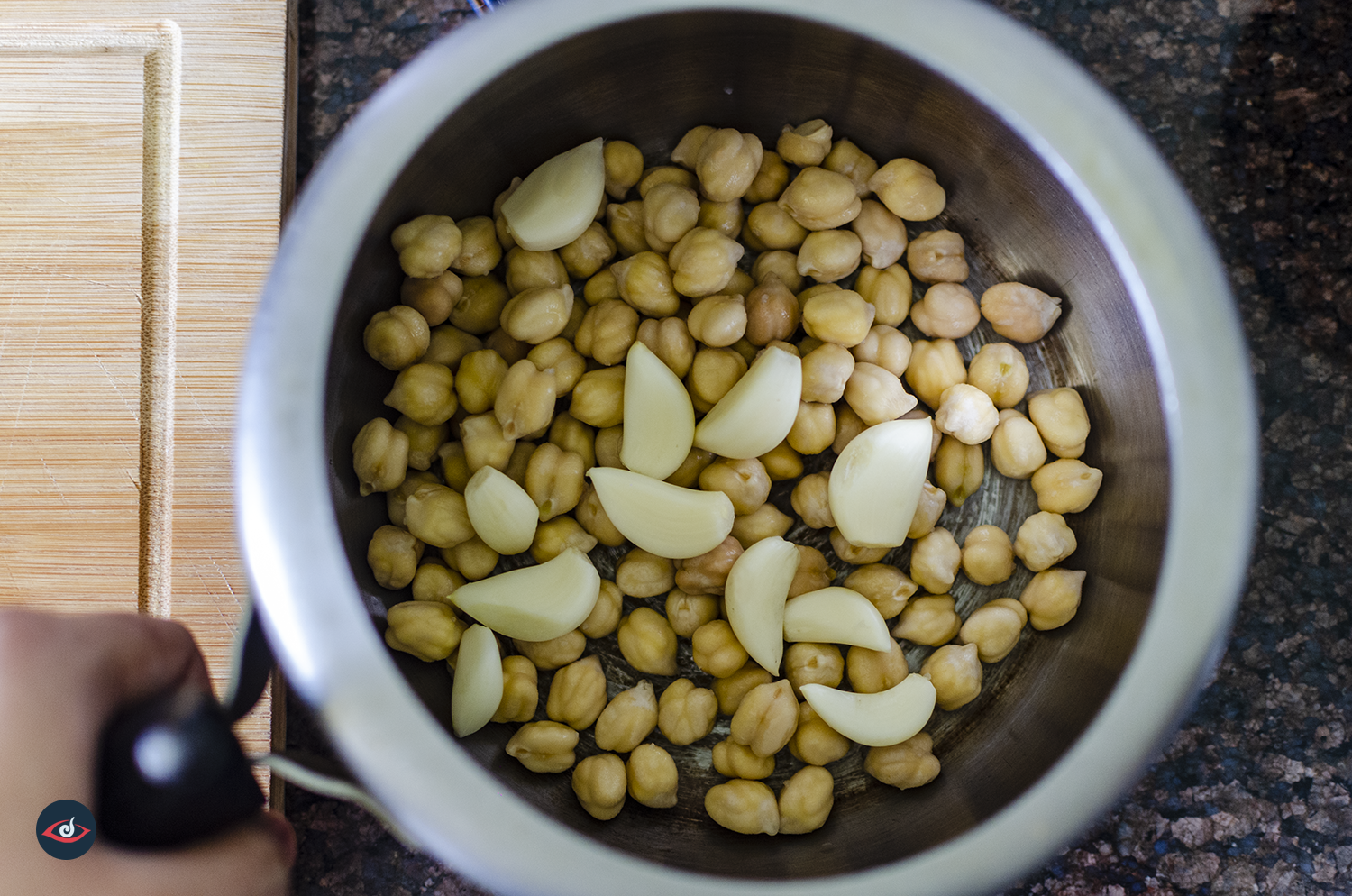 If, like me, you are using a pressure cooker, start cooking at a high flame until the first whistle. Then, turn the heat down all the way and cook for ten minutes. Take the pressure cooker off the heat and let the pressure of the steam release gradually, by itself. Strain the boiled chickpeas and the boiled garlic and reserve the excess water. We will use this later. -
