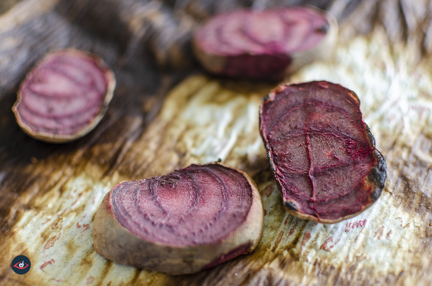 Wash a beetroot thoroughly. Cut the top/tail and slice into discs. Arrange on a baking sheet and bake at 200°C for 15 minutes or until it is slightly charred on the edges and fragrant.