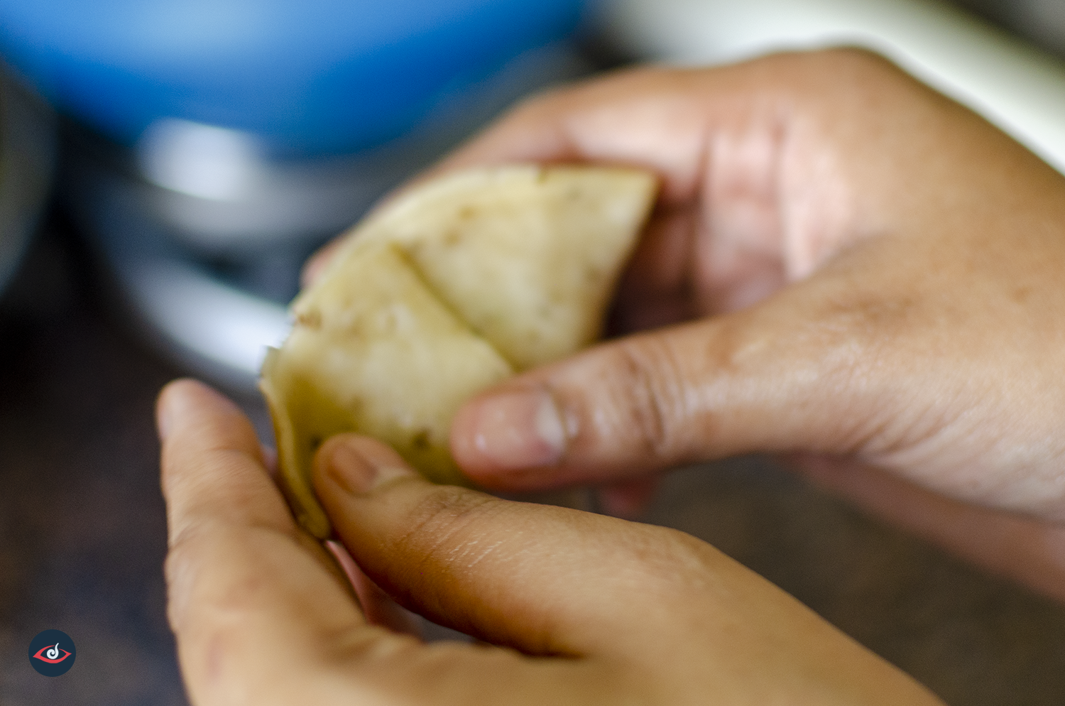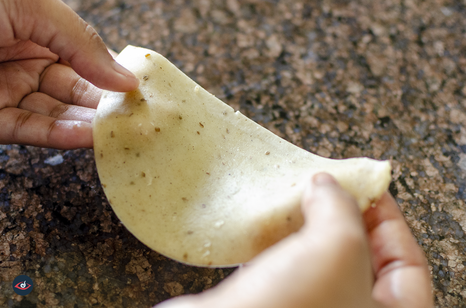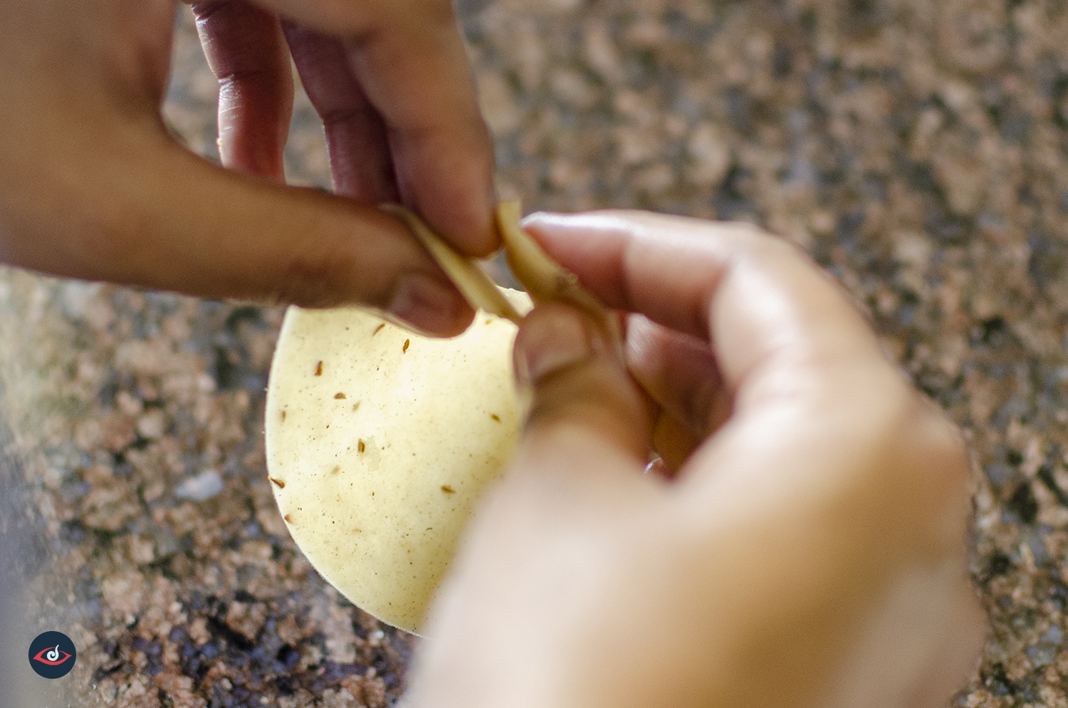 Prepare the dough by pouring the oil into the maida. Add ajwain and salt. Rub the oil into the maida with your fingers and between your palms in a back and forth motion so that the oil is properly incorporated and the maida looks like crumbly sand. Add water very gradually and start kneading with a light hand. Dough should be stiff. If it’s soft that means you have added way too much water. When the dough comes together, cover with a cheesecloth and let it rest for 30 minutes. This will allow to get hydrated and it will be more pliable.