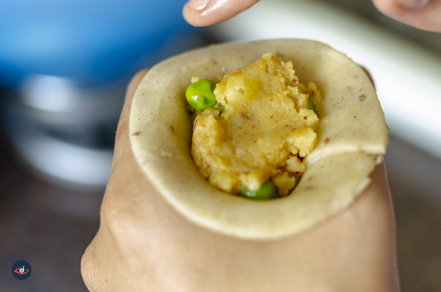 For the filling peel and boil the potatoes. Cool and mash them roughly within your fist. Simultaneously, heat mustard oil in a pan. Keep the flame low and add cumin seeds. When the cumin seeds start sputtering, add the potatoes and ‘turn’ them over with a spatula so that they get coated with the tempered oil. Now add all the powdered masalas. Cook the potatoes on low flame for 4-5 minutes until the potatoes leave the sides. Add peas and cook for another minute. Keep stirring the potatoes so that they cook evenly and don’t get burnt. Take the filling off the flame and cool.