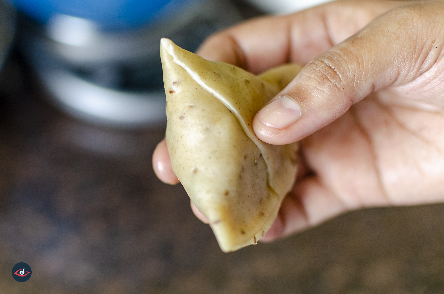 Holding this steadily, gently, like an ice cream cone, in your left hand, take a little filling in your right hand and stuff it into the ‘samosa cone’ pushing it into the very tip. The samosa shouldn’t be stuffed recklessly or under-stuffed because you will not be able to seal it or it will be flat and misshapen respectively. Take care not to stretch the dough when you are filling it. Leave 1 cm space at the top, use your right index finger to rub water along the periphery and seal the seams with a pinching motion of your fingers. Make sure that you seal the vertical seam to the middle of the samosa, otherwise your samosas run the risk of being ‘flat’.