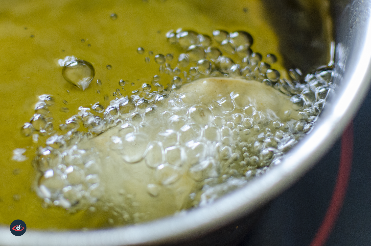 Cover the samosas and heat your oil. The ideal temperature at which these goodies should be fried is 160°C Any hotter and your samosas will blister on the surface. When you put the samosas in the hot oil you should see only tiny bubbles with no violent activity on the surface. If the oil smokes and spits excessively then the oil is too hot. Turn the heat down and wait for the correct temperature before you start frying.